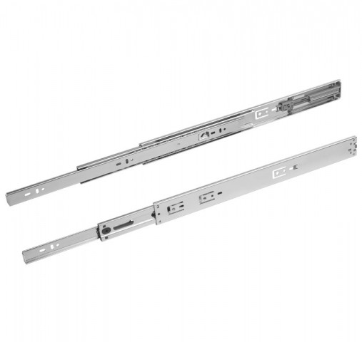 Descrição: Corrediça telescópica com abertura total do comprimento nominal com deslizamento através de esferas de aço e fechamento suave das gavetas, através de molas e pistão. Peça única de montagem lateral autotravante no final do curso aberto e travas no final do curso que permitem a retirada da gaveta.