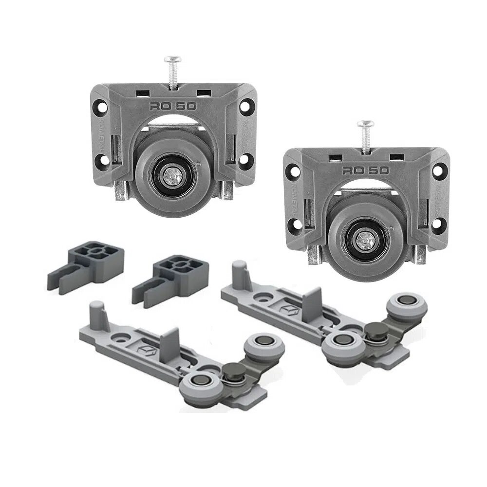 Sistema deslizante para armários com mola antidescarrilamento, trava automática e sustentação na base, o Sistema Deslizante RO 50 4026 (50 Kg) Sobreposto para 01 Porta Rometal é indicado para portas de madeira (MDF, MDP) ou alumínio com espessura de 15 a 25mm (escolha os trilhos que correspondem a espessura da porta) e peso de até 50 Kg por porta.
